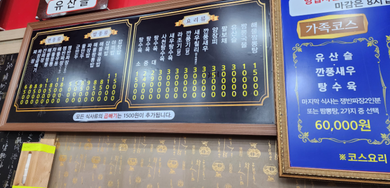 기본 짜장은 6,500원, 간짜장 8,500원, 해물짬뽕 9,000원있고, 탕수육 소자는 15,000원이었습니다. 저는 간짜장 곱빼기, 해물짬뽕, 탕수육 소자를 주문하였습니다. 곱빼기는 1,500원 추가입니다. 여름에는 콩국수도 합니다. 8,500원입니다.