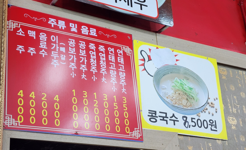 기본 짜장은 6,500원, 간짜장 8,500원, 해물짬뽕 9,000원있고, 탕수육 소자는 15,000원이었습니다. 저는 간짜장 곱빼기, 해물짬뽕, 탕수육 소자를 주문하였습니다. 곱빼기는 1,500원 추가입니다. 여름에는 콩국수도 합니다. 8,500원입니다.