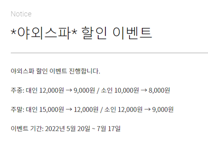 22년 7월 17일까지 할인 이벤트 중으로 주중 대인 9,000원/ 소인 8,000원, 주말 대인 12,000원/ 소인 9,000원입니다. 성수기 전에 이용하실 분들은 참고 바랍니다.