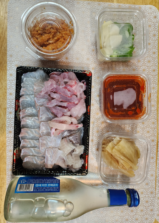신상 포장횟집 "진짜 낚시꾼" 구매 후기입니다. 아래 사진은 소자르 구매한 사진입니다. 고기 종류는 정확하게 모르지만, 사이즈 비교를 위해 별빛 청화와 함께 사진을 찍었습니다. 개업 시에 소주 증정 이벤트를 한다면 좋을 거 같긴 합니다. 사진을 보시면 2인이서 한잔 하기에 딱 좋은 양이었습니다. 야채도 함께 주문을 했는데 사진에서 누락되었네요. 진짜 낚시꾼 회인지 모르겠지만 다른 횟집보다 회가 더울 쫀득하게 느껴졌습니다. 회의 풍미가 살아서 소주를 부르는 맛이라고 느꼈습니다. 첫날의 감동이 쭉 이어진다면 아마 단골이 되지 않을까 생각이 들 정도였습니다. 아직 매운탕은 하지 않았지만 매운탕으로 마무리한다면 기대해 볼만합니다.