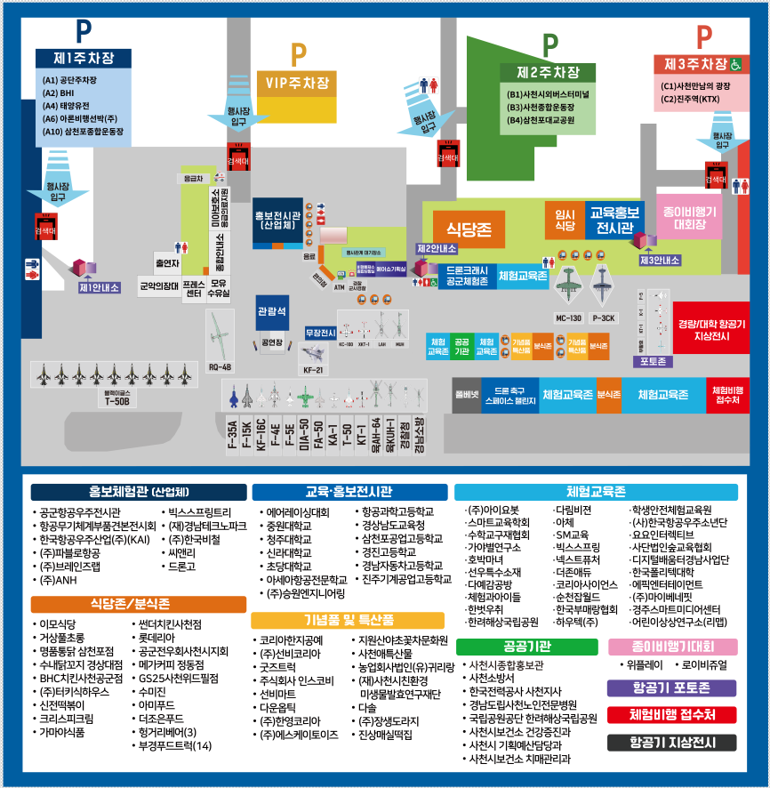 사천 에어쇼 행사장 안내도입니다.  주차장은 총 3군데가 있으니 내린 주차장을 잘 기억하셔서 돌아가야 됩니다. 이번에는 F-35과 KF-21 보라매를 볼 수 있습니다. 화장실이나 식당 존 쉬는 곳 참고하셔서 가시면 좋겠습니다.