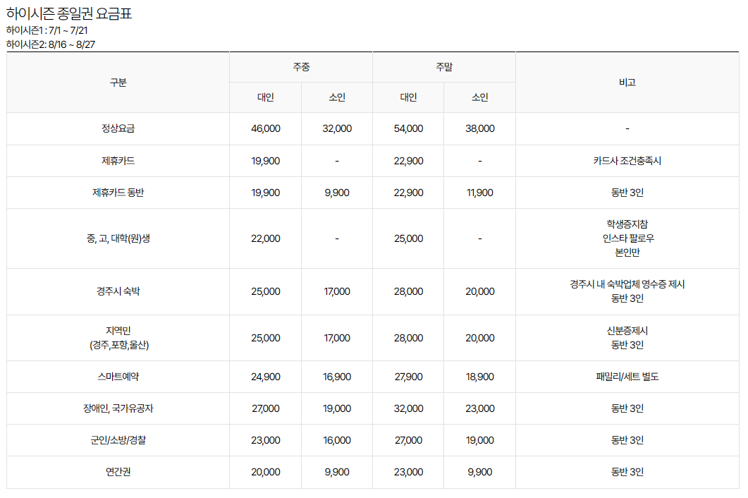 2023년 경주월드 캘리포니아 비치 상세 요금표
