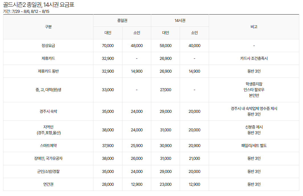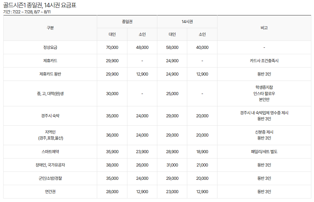 2023년 경주월드 캘리포니아 비치 상세 요금표