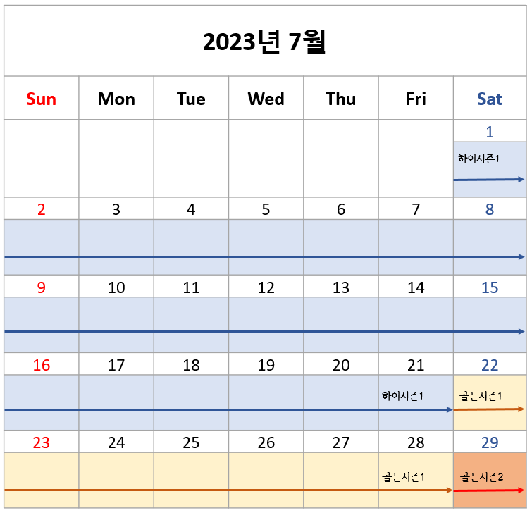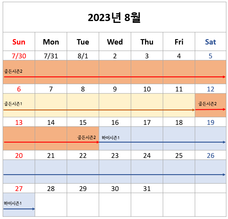 앞에서 말씀드린대로 2023년 경주월드 캘리포니아비치는 시즌을 하이시즌, 골드시즌1, 골드시즌2로 구분했습니다. 하이시즌도 사실 1/2로 나눠져 있는데 요금에 구분이 없어 따로 구분하지 않았습니다. 쉽게 생각해서 성수기는 골드시즌1, 극성수기 및 광복절 휴일 주말은 골드시즌2라고 생각하시면 됩니다. 그 외에는 전부 하이시즌입니다. 아래 달력으로 표시해 드리겠습니다.