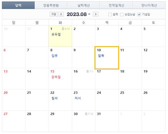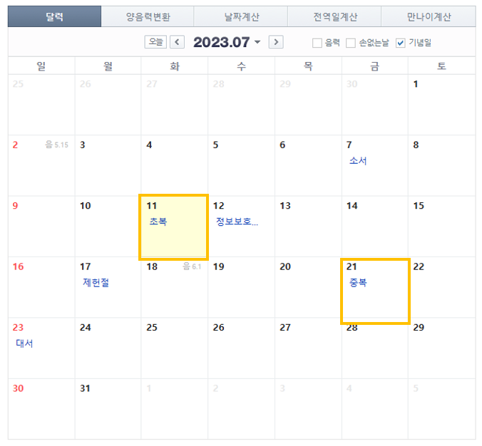 2023년 복날( 초복, 중복, 말복) 날짜는 언제인지와 추천하는 창원 삼계탕집 3곳을 알아보겠습니다. 먼저 2023년 복날은 아래와 같습니다. 네이버 달력 기준으로 알려드립니다.