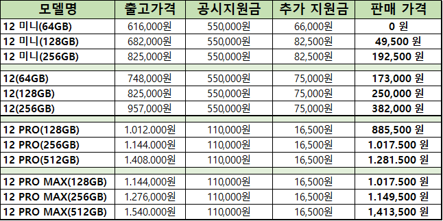 22년 5월 11일 기준으로 SK텔레콤에서 아이폰12 시리즈 4종에 대해 출고 가격을 인하하였습니다. 해당 제품은 아이폰 12 미니, 아이폰 12, 아이폰 12 PRO, 아이폰 12 PRO MAX로 출고 가격을 각 33만 원씩 인하하였습니다. 각 시리즈 별로 공시 지원금이 상이하지만 전반적으로 많은 할인이 되어 13과 12 사이에서 고민하시는 분들에게 좋은 선택지가 되리라 생각됩니다.